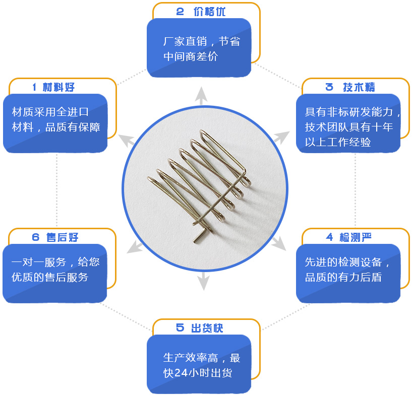 | 不銹鋼絲 (sus) | 有磁、無磁、光面和霧面 (樹脂面、暗面) | 201、202…… | 含鎳量少,達不到鹽霧測試 要求。 | 工藝彈簧多用此材料 |